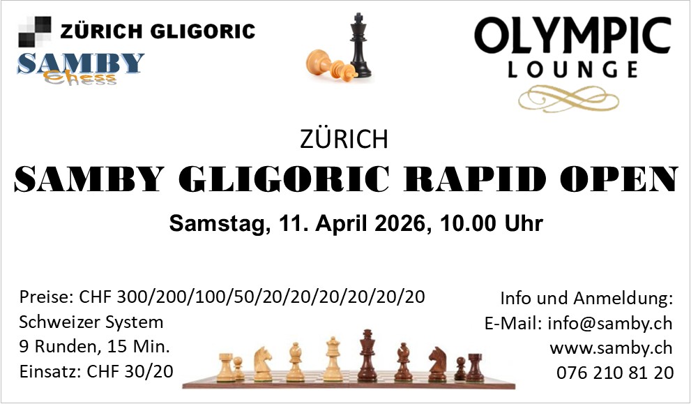 Anmeldung per E-Mail info@samby.ch oder SMS 076 210 81 20. Ausschreibung hier. Teilnehmer auf chess-results.com hier.
